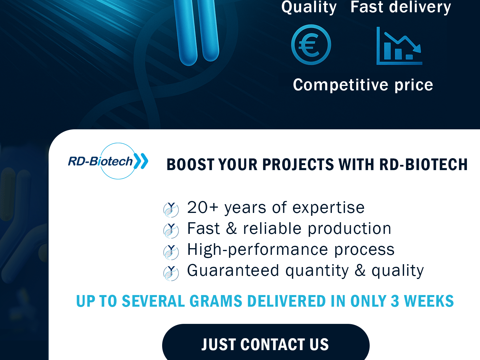 RD-Biotech, CRO/CDMO en biotechnologie depuis 2002, propose des solutions sur-mesure en biologie moléculaire, immunologie et ingénierie cellulaire pour la R&D, les phases précliniques et cliniques, avec expertise, réactivité et confidentialité.